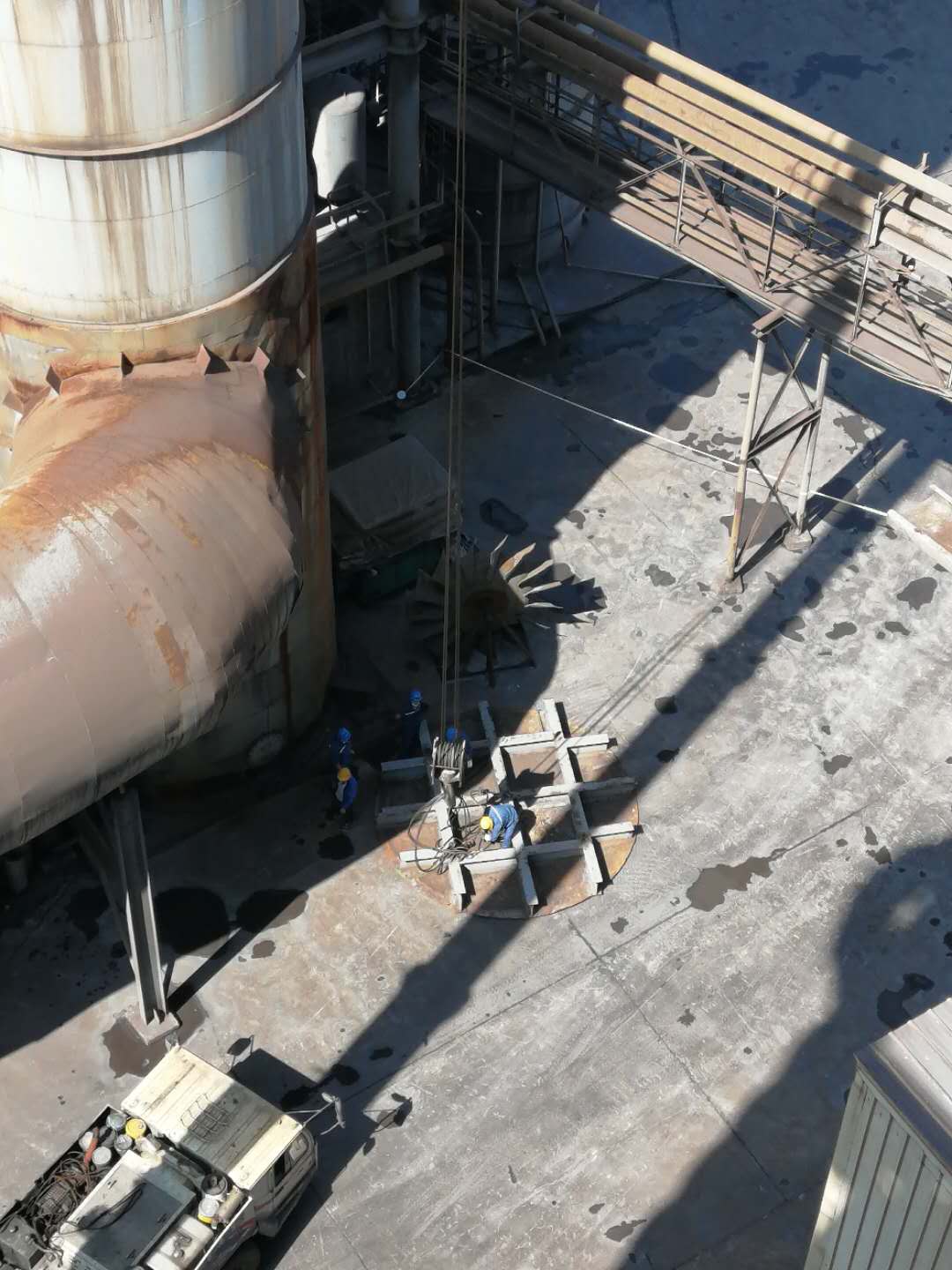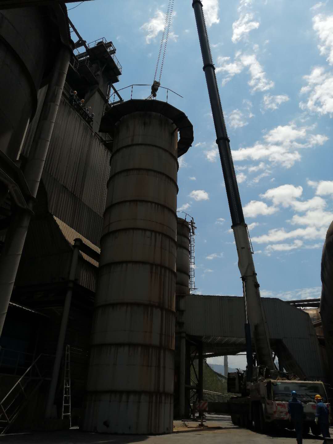6月2日天氣晴朗,風(fēng)力1級,具備良好的施工條件,7:30分130噸的吊車準(zhǔn)時(shí)到達(dá)拆除現(xiàn)場,檢修班長針對性的給班員講解具體的拆除工序,具體的安全措施、落實(shí)到個(gè)人、落實(shí)到互保對子。8:30分煙囪頂部的大蓋安全拆除,13:15分30噸重的第一節(jié)煙囪安全拆除,16:00分15噸重的第二節(jié)煙囪安全拆除。