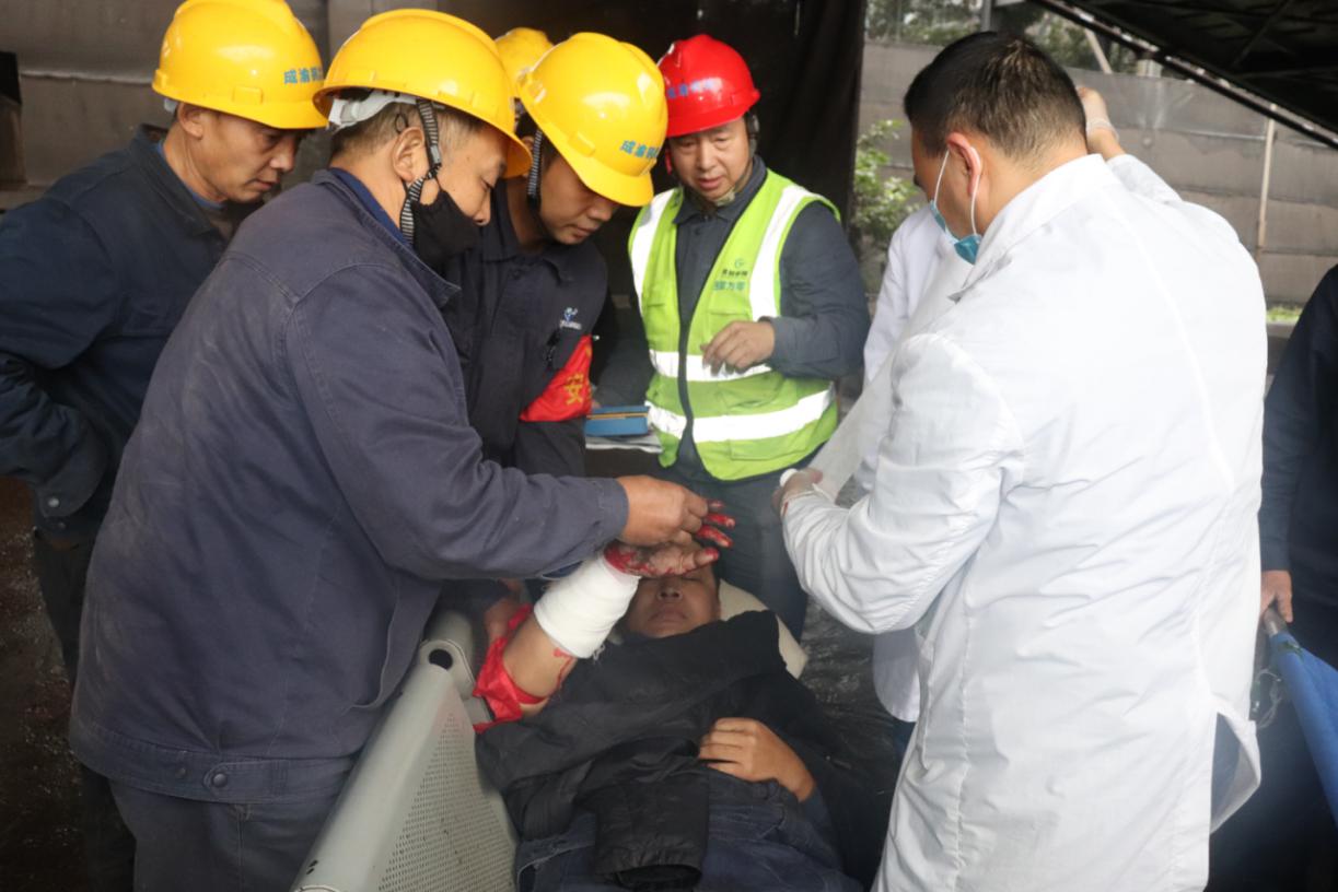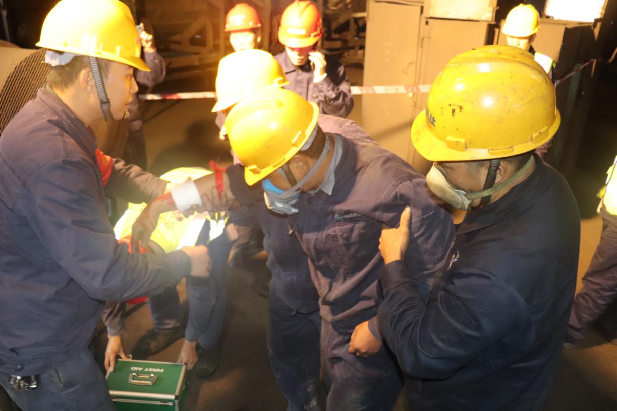 在廠長助理王武鼎宣布燒結(jié)廠皮帶絞傷事故應急演練開始后,全體人員按照演練計劃迅速開展相關(guān)部署,現(xiàn)場模擬皮帶絞傷事故。