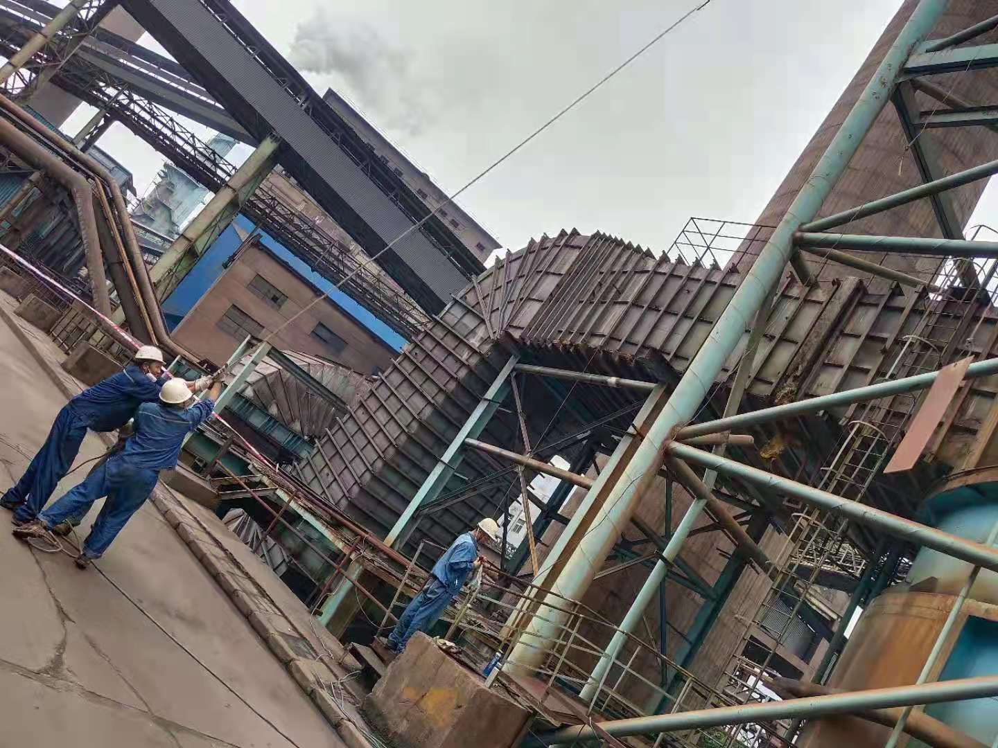 6月23日班前會(huì)檢修班長(zhǎng)劉武對(duì)六燒出口在線監(jiān)測(cè)平臺(tái)鋼板更換工作做了詳細(xì)的人員部署和安全注意事項(xiàng)講解。8:30檢修組人員到達(dá)現(xiàn)場(chǎng),吸收塔周邊拉好警戒線,其中3人到達(dá)除霧器平臺(tái)對(duì)地面人員進(jìn)行指揮,地面人員將鋼板掛在繩子的一端,另一端3人托攥繩子,通過定滑輪緩慢的將鋼板運(yùn)輸至除霧器平臺(tái)。采用相同的辦法,將運(yùn)輸至除霧器的鋼板又轉(zhuǎn)運(yùn)至在線監(jiān)測(cè)平臺(tái)。大家通過3小時(shí)的齊心協(xié)力,將30平方鋼板全部轉(zhuǎn)運(yùn)至出口在線監(jiān)測(cè)平臺(tái)。隨后檢修人員利用4小時(shí),安全、高效的將所有腐蝕的平臺(tái)更換完畢,完成了本次安全隱患消除項(xiàng)目。