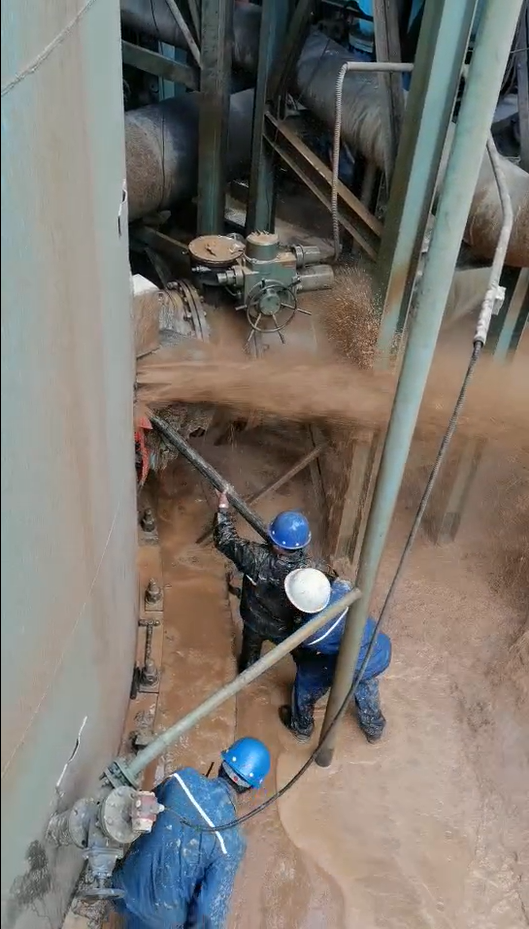 6:30分劉武到達(dá)三燒現(xiàn)場(chǎng)。更換工作服和雨衣后,投入到漏漿堵塞過(guò)程中。因漏漿孔太大,塔內(nèi)漿液泄露量大,壓力大,漿液溫度高,在嘗試幾次使用破布和木削封堵無(wú)果后,開(kāi)始采用其他封堵措施。經(jīng)過(guò)幾次嘗試封堵,劉武全身已被噴涌而出的漿液打濕。為了爭(zhēng)分奪秒的解決漿液泄露,劉武顧不上打濕的衣服,經(jīng)過(guò)現(xiàn)場(chǎng)與生產(chǎn)部、班組長(zhǎng)和崗位人員溝通后,決定采用一根木棍一端抵靠在循環(huán)泵支架梁上,一端封堵漿液泄露位置,F(xiàn)場(chǎng)準(zhǔn)備好相關(guān)材料后,大家齊心協(xié)力,不怕困難,勇往直前,幾次嘗試后最終將木棍抵靠在循環(huán)泵支架梁和吸收塔漏漿位置,成功將漿液泄露堵住。