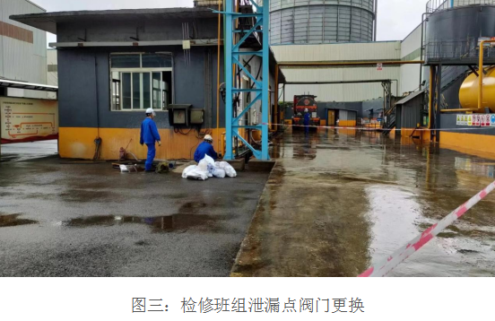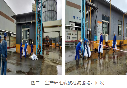 本次演練模擬硫酸卸車泵房硫酸管道泄漏,14:00當(dāng)班兩名酸堿工巡查酸堿管網(wǎng)時(shí)發(fā)現(xiàn)酸堿卸車區(qū)閥門滲漏;現(xiàn)場人員立即通知當(dāng)班班長,班長立即組織人員準(zhǔn)備急救物資;14:02當(dāng)班班長趕到現(xiàn)場查看滲漏情況后立即組織人員用應(yīng)急沙進(jìn)行圍堵并安排人員拉好警戒線維持好現(xiàn)場次序;14:03當(dāng)班班長將情況匯報(bào)調(diào)度室,同時(shí)通知檢修到場,調(diào)度室第一時(shí)間通知安全環(huán)保科;14:05檢修到現(xiàn)場確認(rèn)情況,制定出檢修方案并開始檢修,同時(shí)現(xiàn)場監(jiān)護(hù)人員確認(rèn)檢修防護(hù)用品是否穿戴完整;14:15經(jīng)過檢修搶修后現(xiàn)場試車確認(rèn),無滲漏,匯報(bào)相關(guān)領(lǐng)導(dǎo)同時(shí)把地面污染物進(jìn)行清理;14:25經(jīng)過相關(guān)領(lǐng)導(dǎo)確認(rèn)后,無滲漏,同意恢復(fù)生產(chǎn);14:28匯報(bào)調(diào)度,調(diào)度室通知恢復(fù)正常生產(chǎn)。