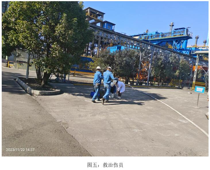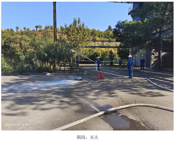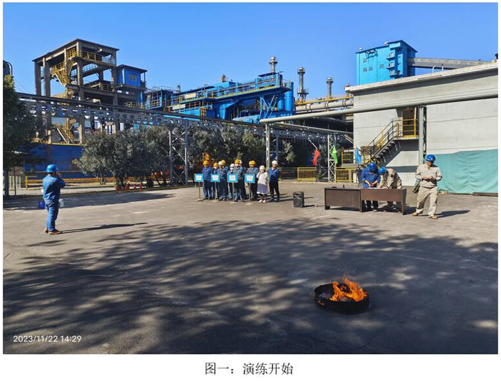 本次演練模擬2023年11月22日10:00分,焦化脫硫脫硝巡檢員發(fā)現(xiàn)焦化6號門因其他公司職工在外抽煙后,煙頭未熄滅直接丟入綠化帶,將綠化帶內(nèi)干雜草點燃,發(fā)生火災,后藍鼎公司現(xiàn)場巡檢員立即上報并按領(lǐng)導指示警戒、滅火、救治傷員、現(xiàn)場清理、結(jié)果匯報等措施消除火災。